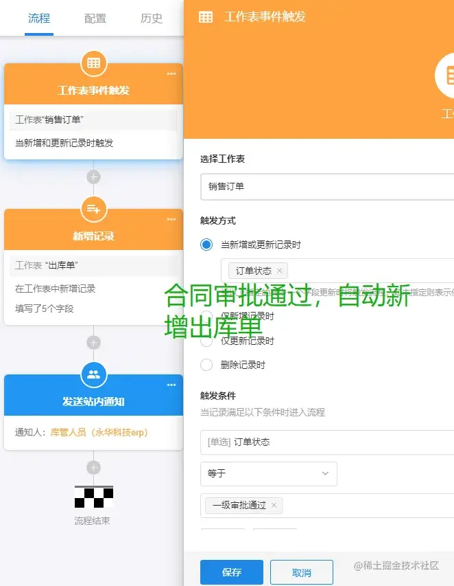 **解决方案:**通过工作流自动提醒跟进客户,自动创建订单,自动提醒出库、发货、发票、收款等。