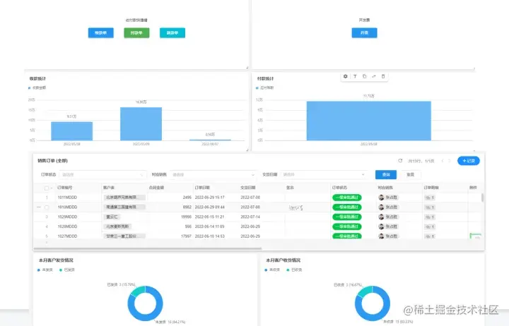 发票、客户跟进和退货单等工作表涉及到的数据、展示、工作流等与客户表、订单表的工作流基本类似,在此就不一一叙述了。
