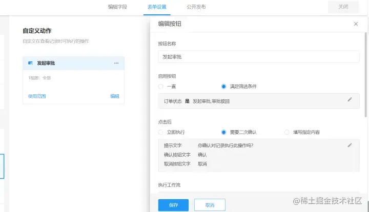 销售审批工作流设置:点击发起审批按钮,有按钮出发工作流,具体如下图所示。