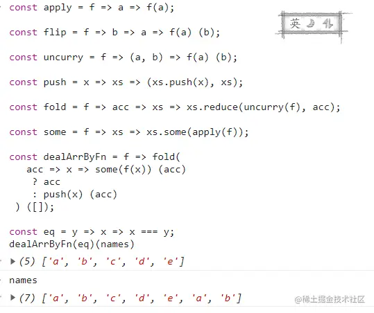 em,都写到这了,我们可以再进阶再抽象一下,让我们的去重也可以写成一个非常抽象的链式调用。多重箭头函数其实就是函数珂里化的语法糖(fn(a,b,c)改造成fn(a)(b)(c)),让我们完成一个参数对齐。