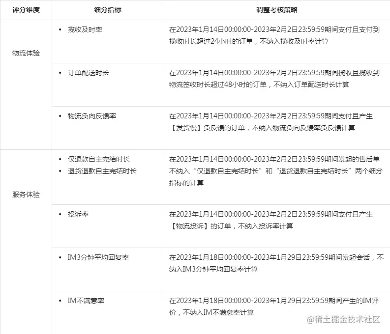 因受春节运力变化、假期等客观因素影响,为保障全量商家(含全球购及未参加春节不打烊活动商家)经营体验,平台针对商家体验分部分指标考核也进行了调整,具体如下:
