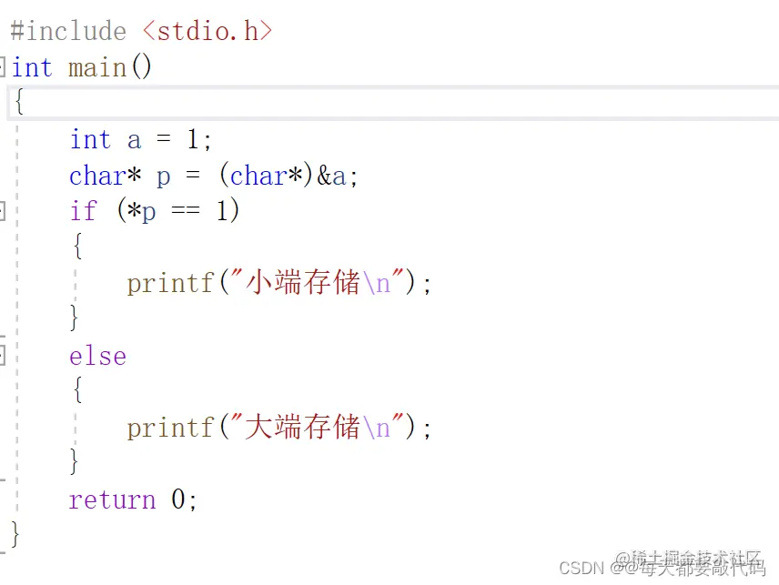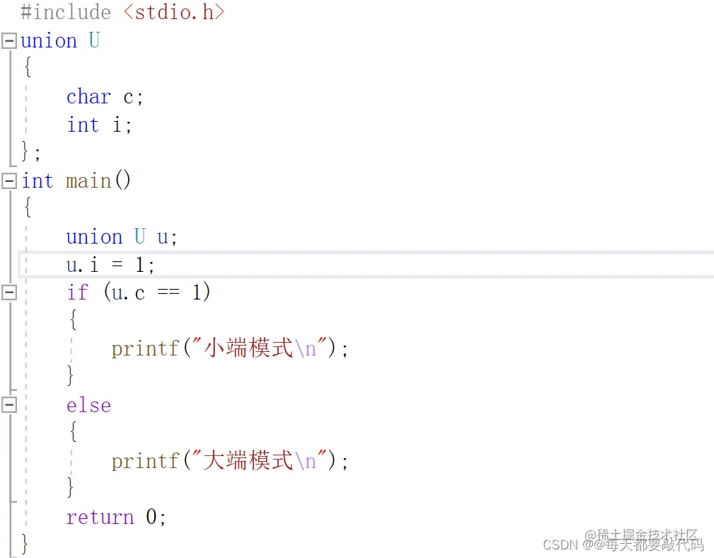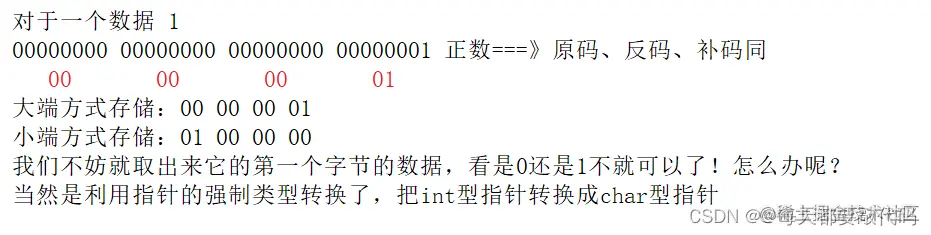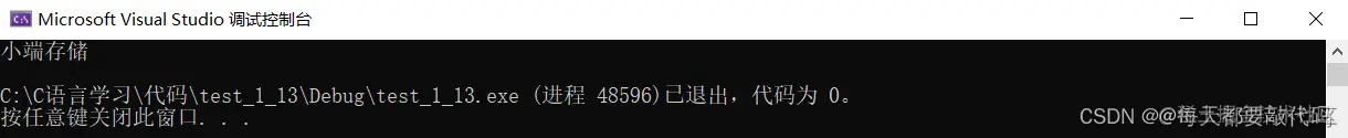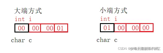 我们给i赋值为1;如果在大端模式,在内存中存储就是00 00 00 01,那么我们取出c,虽然c并没有赋值,但是联合体共用同一块内存,所以取出来c的值也就是0。如果在小端模式,在内存中存储就是01 00 00 00,那么我们取出c,虽然c并没有赋值,但是联合体共用同一块内存,所以取出来c的值也就是1。