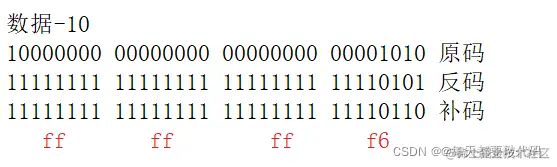 我们发现对于数据**-10**,在内存中的存储形式居然是f6 ff ff ff,我们不妨写一下它的原码、反码、补码: