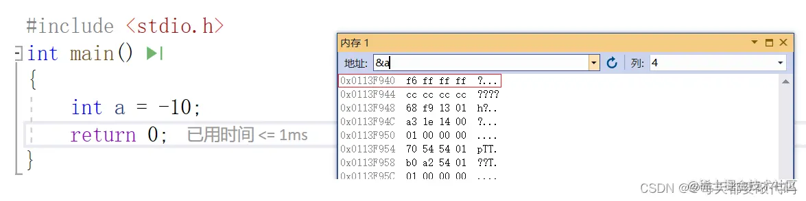 在这里我们发现数据**-10的补码刚好就是对应内存中存放的数据;并且它是从最低位f6开始,我们称之为小端模式,具体小端方式是什么,我们下面会讲!这里先给出得到的两个结论**:
