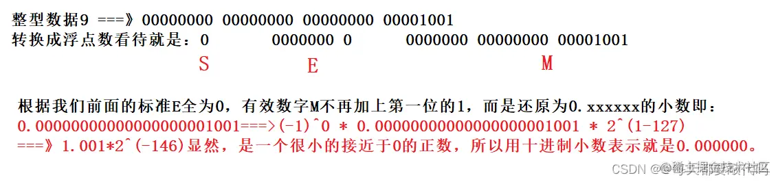 浮点数的指数E等于1-127(-126)(或者1-1023(-1022))即为真实值;有效数字M不再加上第一位的1,而是还原为0.xxxxxx的小数。这样做是为了表示±0,以及接近于0的很小的数字