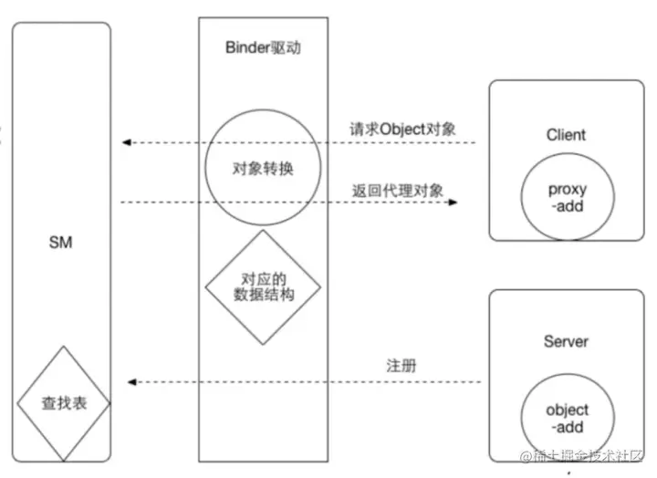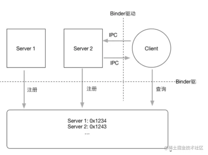 首先:Server会把自己注册到ServiceManager的查询表中 然后:Client开始查询ServiceManger,拿到Server的代理对象;为什么是代理对象,因为client和server都是在用户空间,binder驱动是在内核空间 无法返回一个真正的server对象,只能返回代理对象,这一层封装对于client是透明的。