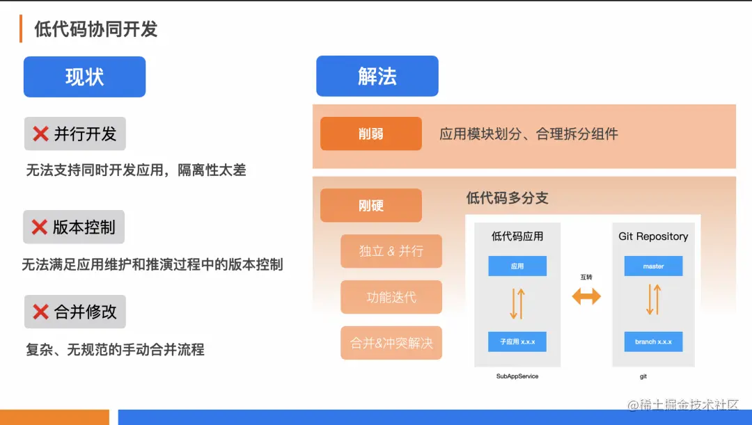 随着低代码的普及,在低代码平台上构建企业级应用逐渐成为生产趋势。同时,随着低代码技术的提升,越来越多的复杂应用在低代码平台中完成。在其研发生命周期中,低代码开发者就会面临多人协作、并行开发、维护多版本的场景。而现有的低代码平台普遍缺乏这一能力或支持较弱,导致对协同开发的成本较高,限制了迭代的效率。
