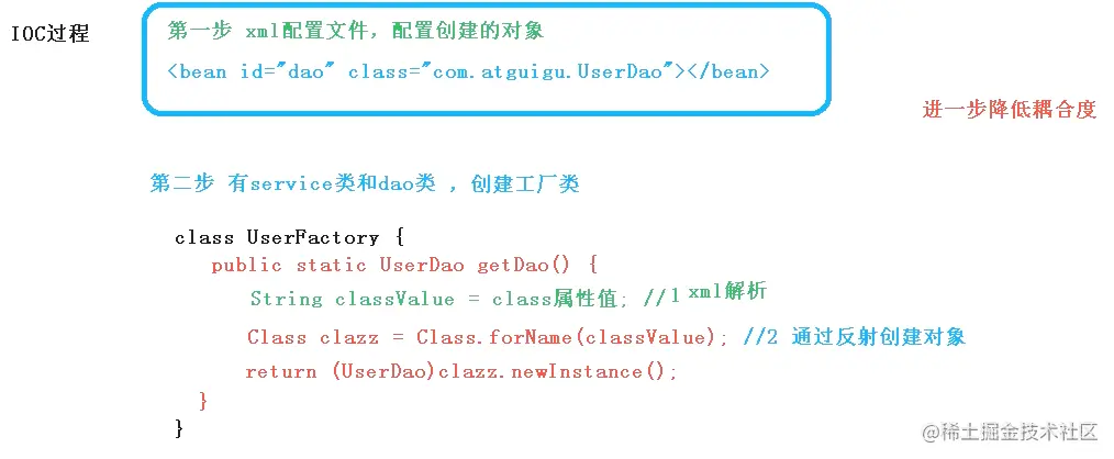 1)在 Spring 配置文件中,使用bean标签,标签里添加对应属性,就可以实现对象的创建