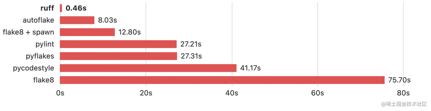 Rust 编写的 Python linter,从下图的性能对比中可以看出 Ruff 的性能是其他工具的几十倍。不同于传统的 linter,Ruff 还支持代码转换,能升级类型注释、重写类定义、对 import 进行排序等等。部分特性如下:
