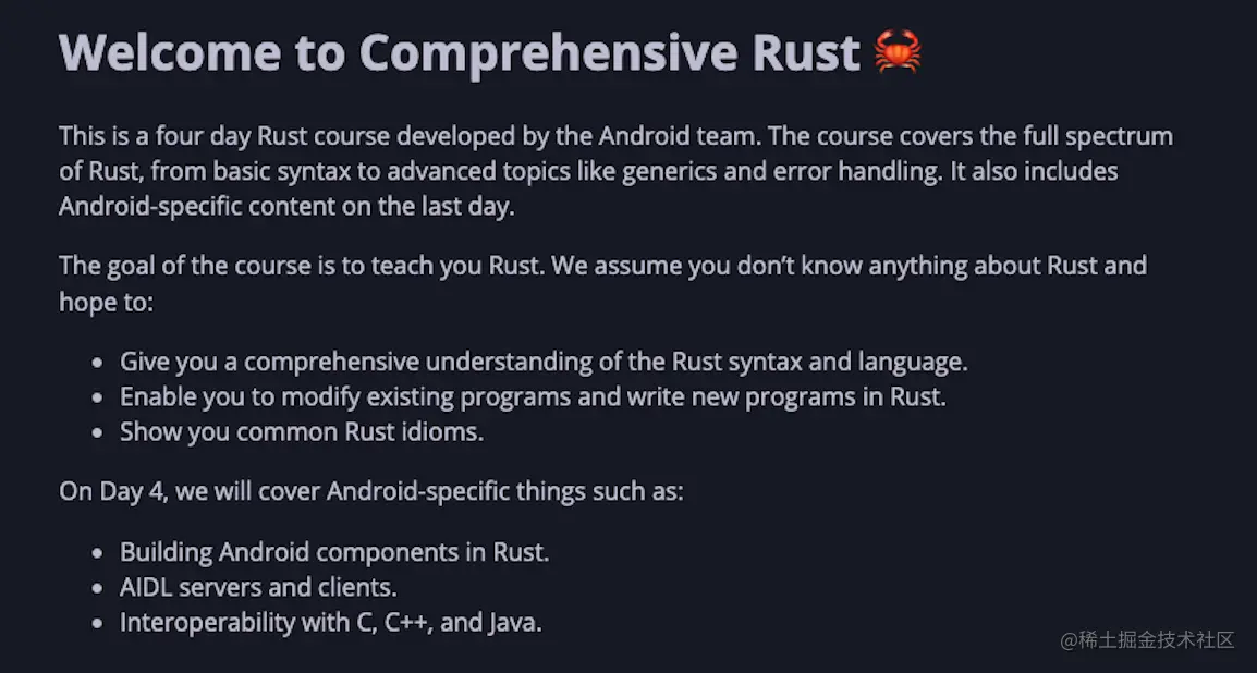 New Google Android 团队开设的为期 4 天的 Rust 综合学习教程,从基础语法学习,再进阶到泛型和错误处理,甚至最后一天还是一个 Android 教学内容。