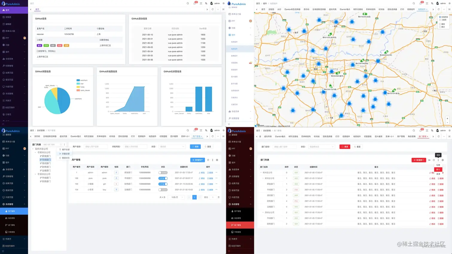 vue-pure-admin 是一款开源免费且开箱即用的中后台管理系统模版。使用了最新的 Vue3、Vite、Element-Plus、TypeScript、Pinia、Tailwindcss 等主流技术开发。