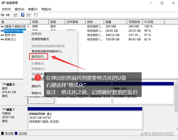 步骤2: 在弹出的界面找到需要格式化的U盘,右键选择【格式化】。