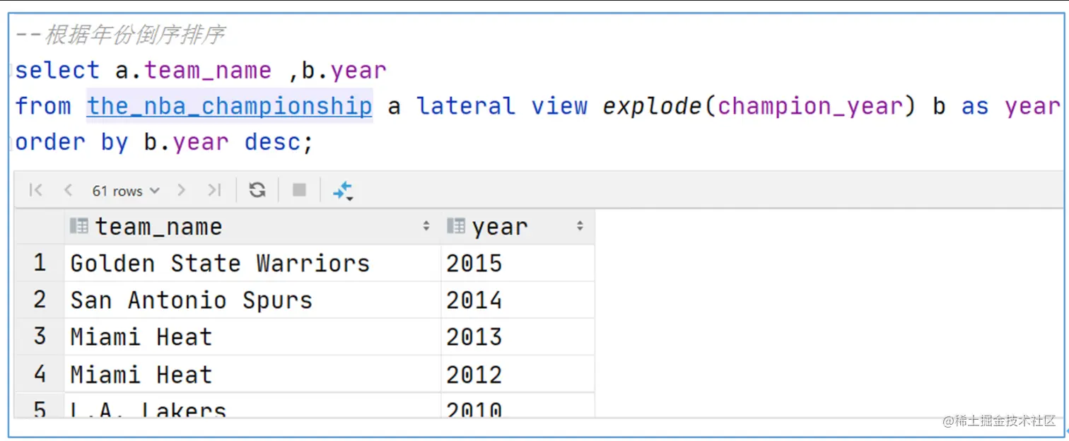 侧视图的原理是将UDTF的结果构建成一个类似于视图的表,然后将原表中的每一行和UDTF函数输出的每一行进行连接,生成一张新的虚拟表。这样就避免了UDTF的使用限制问题。使用lateral view时也可以对UDTF产生的记录设置字段名称,产生的字段可以用于group by、order by 、limit等语句中,不需要再单独嵌套一层子查询。