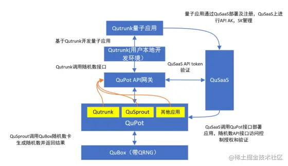 2)直接使用启科量子提供的云上资源,用户注册QuSaaS,根据QuSaaS应用部署创建模板要求开发量子应用,注册应用获取AK,SK,调测中通过API网关调用随机数卡的接口,QuSaaS进行认证授权通过Qusprout调用qubox随机数卡生成随机数。开发完成后通过QuSaaS部署应用到QuPot,此时应用运行在一个qutrunk环境中,掉用随机数过程与本地调用流程一致。逻辑图如下: