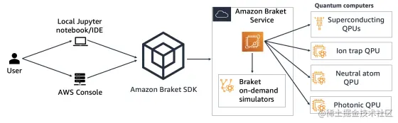Amazon Braket 是一项完全托管式量子计算服务,旨在帮助加快量子计算的科学研究和软件开发。用户可以通过本地Jupyter Notebook/IDE或者AWS console使用Amazon Braket SDK开发量子程序,调用AWS提供量子硬件或者模拟资源运行量子计算程序。