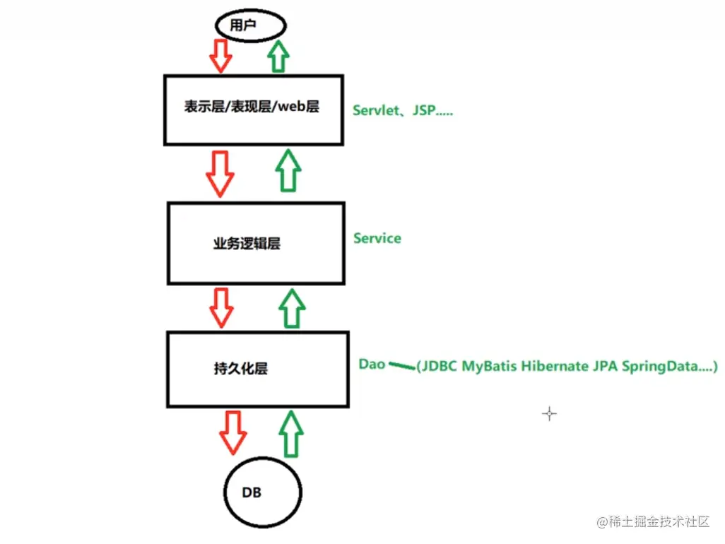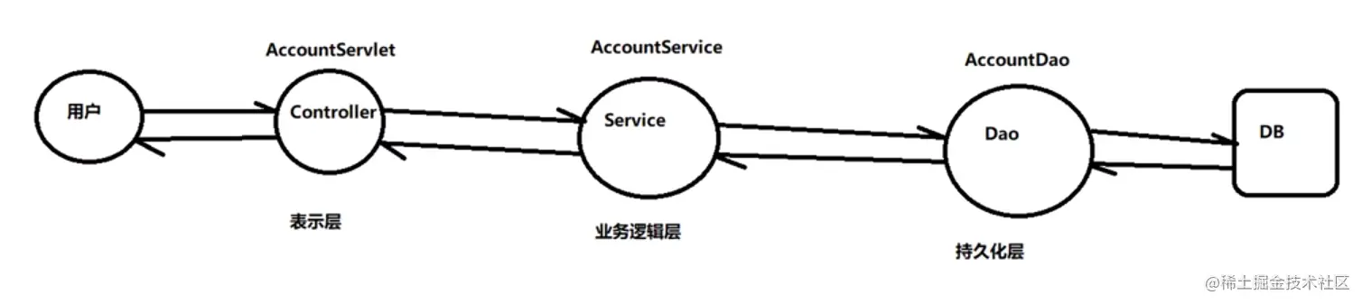 按照三层架构分析:web下的UserServlet是表示层、service包下的UserService是业务层、dao包下的UserDao是持久化层