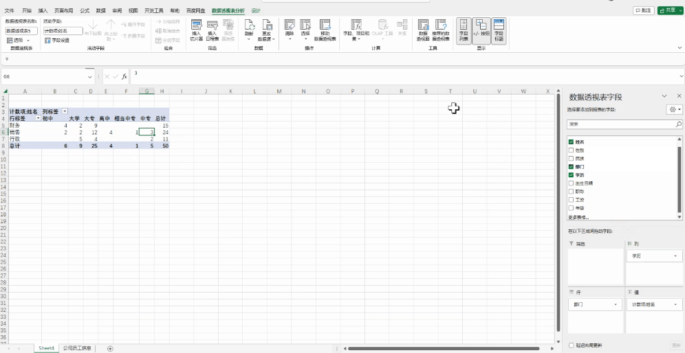 该透视表,行维度为部门信息,列维度为性别,最终统计字段为员工姓名。只需简单几步,即可直观的看到人员性别的统计数据,再也不需要我们去做筛选后再统计数据了。初次之外,透视表可以应对复杂多变的统计条件,某一天,你的领导突然想知道公司人员的学历占比,此时你只需要