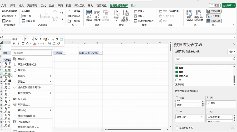 手动刷新下,也分为两种情况,分别是数据源区域未改变及数据源区域发生改变。如果只是单元格数值发生变化,可以选中透视表区域右键刷新或者在透视表分析面板中点击刷新。而如果对数据源进行了删除或新增,则需要手动的去更改数据源。