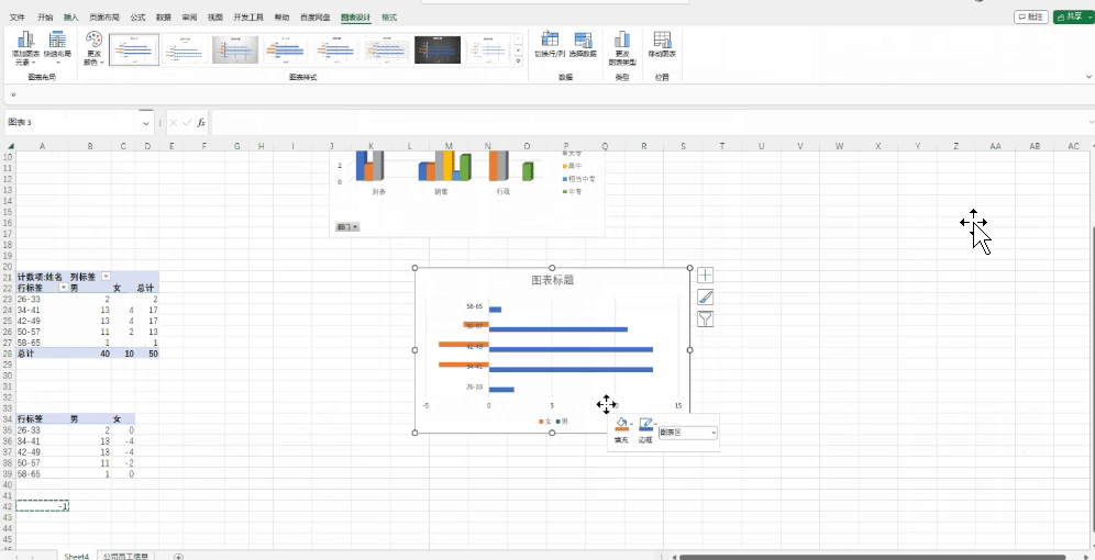 除此之外,透视表也可用于区间数据汇总分析,例如,我们可以分年龄段统计人数。并且统计结果黏贴为普通区域,基于该区域生成一张有对比效果的图表,一起来看看吧~
