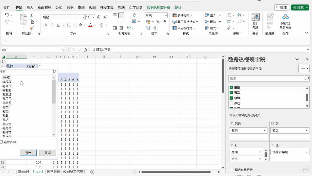 除了制作每个班级的课程表之外,简单的改变透视维度,又可以生成每位老师的课程表: