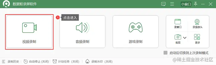 **步骤1:**安装数据蛙录屏软件后,进入软件主界面,在主界面中选择左侧的【视频录制】,也可以根据个人的喜好,选择其他的录制模式。