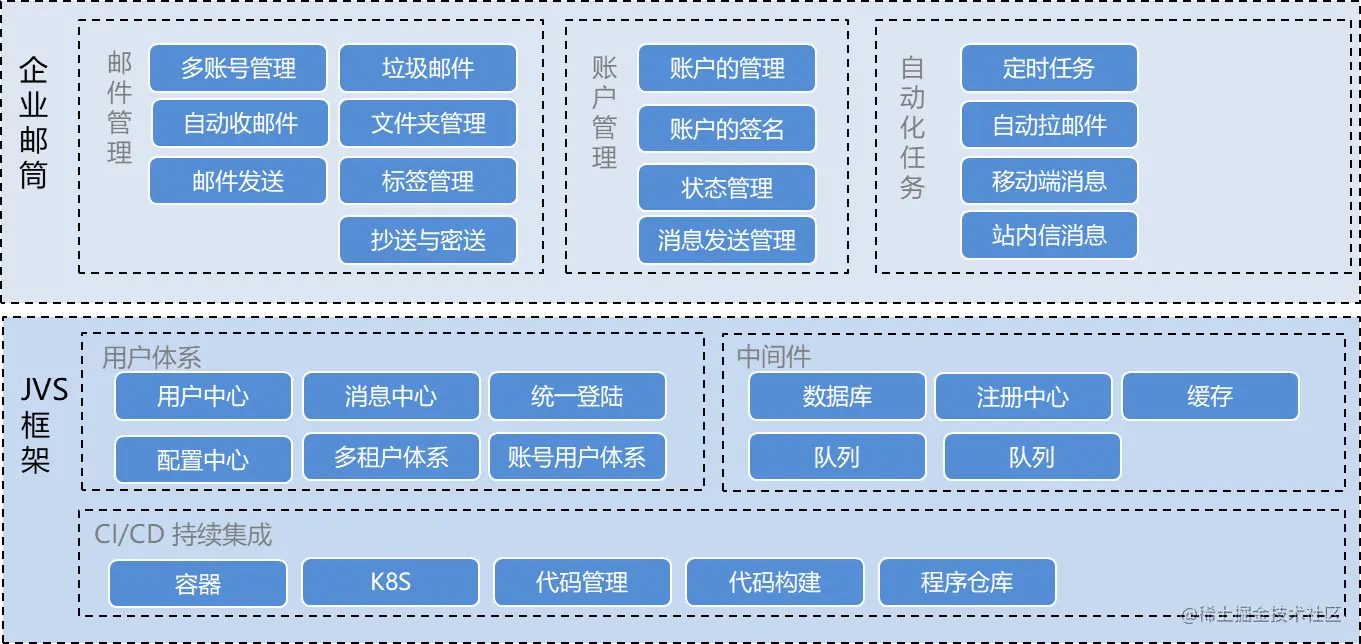 软件架构说明,JVS-mailbox是作为JVS基础框架之上的原生应用,使用相同的用户体系,可以通过企微、钉钉、公众号、用户密码等多种方式登录邮箱。