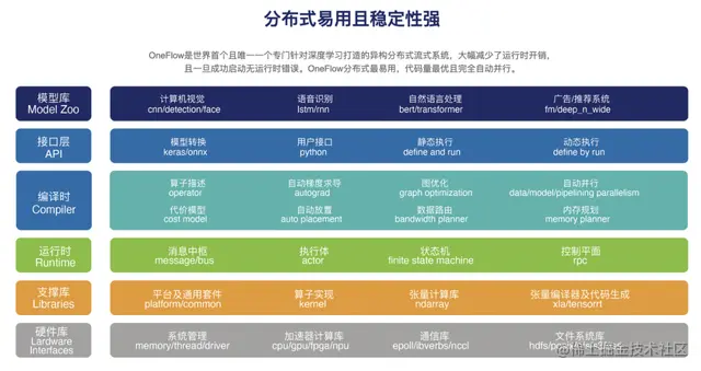 OneFlow(github.com/Oneflow-Inc… 分布式深度学习框架是基于对人工智能技术和应用发展需求的领先数年的前瞻性思考,针对超大规模训练、分布式、异构等带来的挑战,采用全新的“静态编译+流式系统”架构,突破了自动并行、静态调度、去中心化和全链路异步流式执行四大关键核心技术和一系列创新性难题,不仅能够大幅提升硬件资源利用率,而且能够简单方便地实现基于异构集群训练任务的大规模分布式扩展,将系统整体性能提升到极致,从而降低训练成本,提升人工智能应用水平。