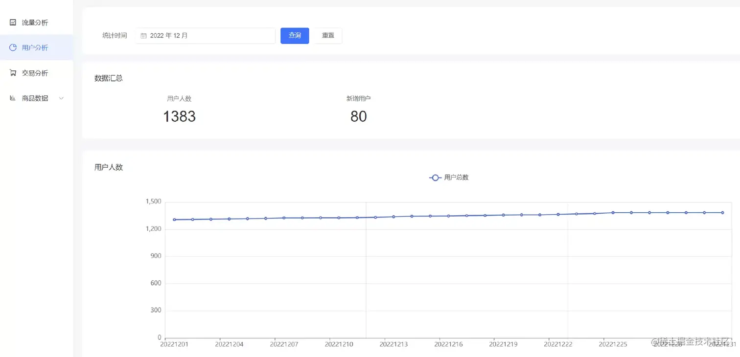 用户分析-可通过统计时间来查询用户数据汇总、用户人数、新增用户,如下图所示: