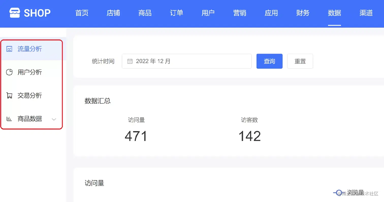 流量分析-可以通过统计时间来查询商城数据汇总、访问量、访客数等,如下图所示: