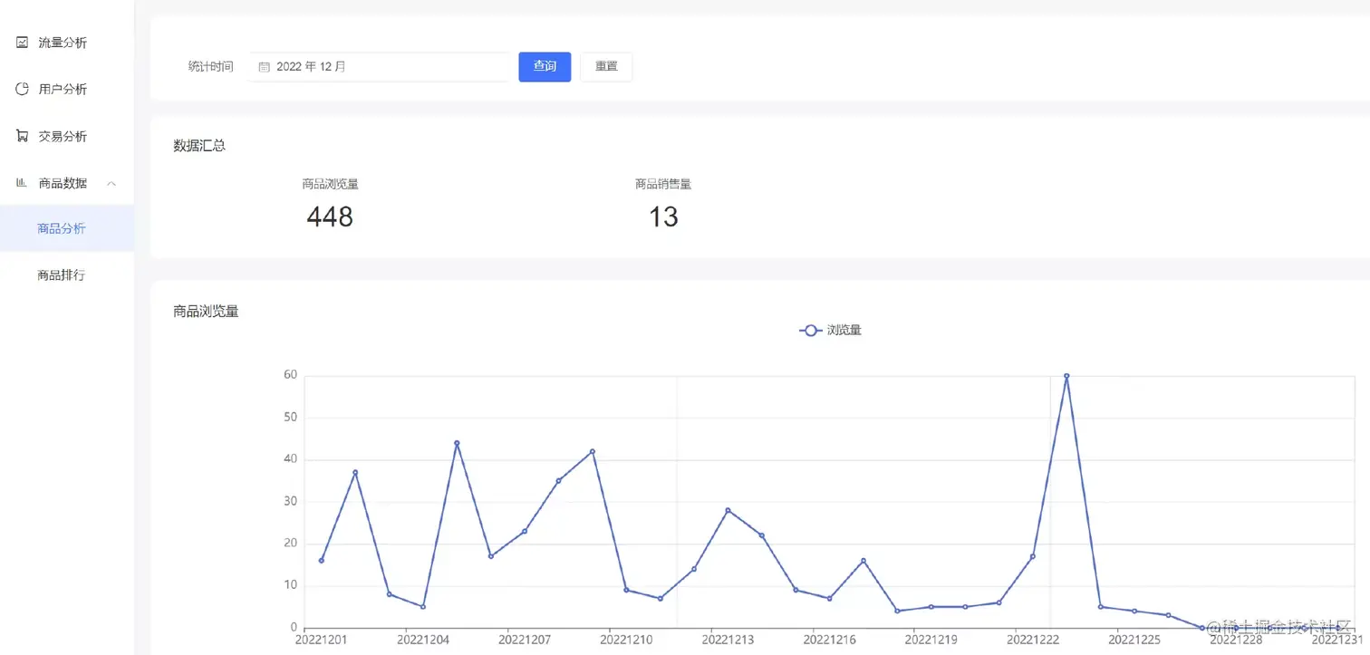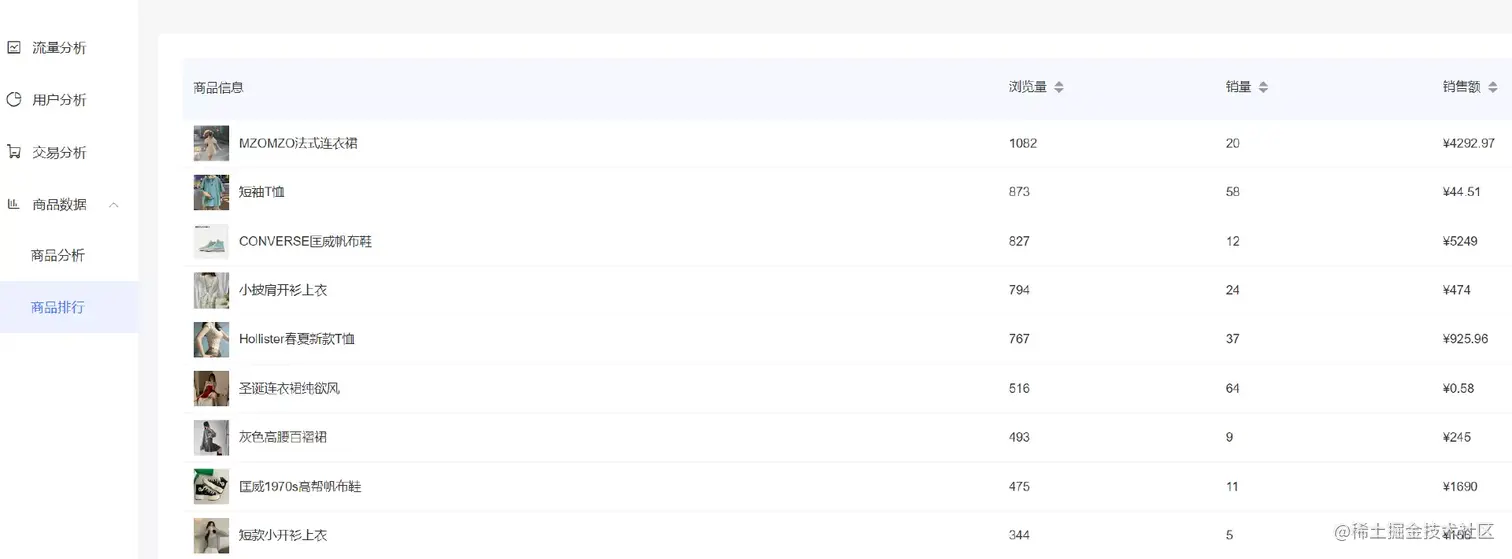 商品数据-有商品分析和商品排行,可通过统计时间查询商品的数据汇总、商品预览量、商品销售量,还可以·查询查询商品的排行,如下图所示: