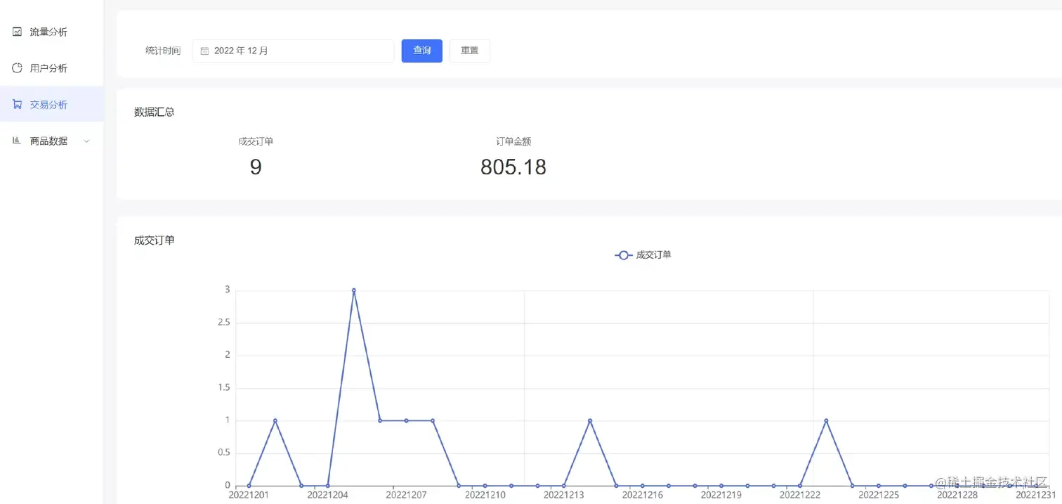 交易分析-通过统计时间查询商城交易的数据汇总、成交订单、订单金额等,如下图所示: