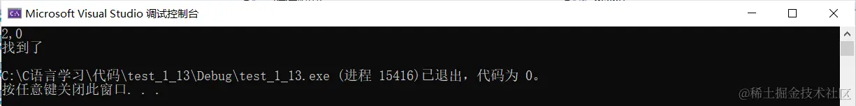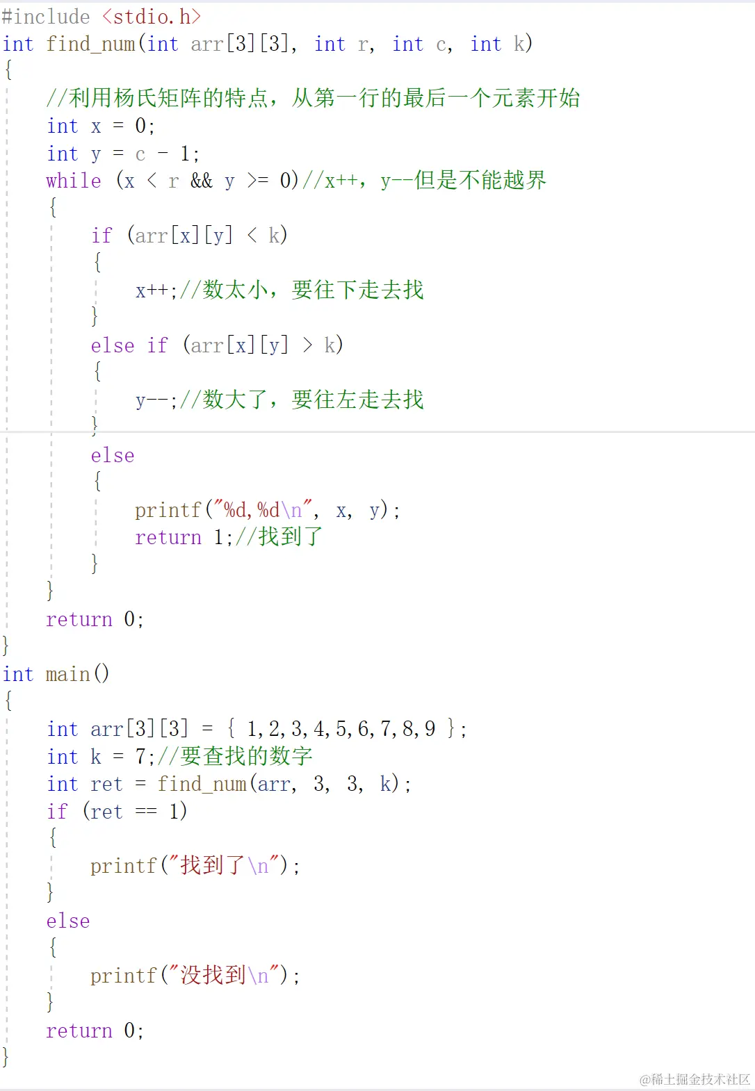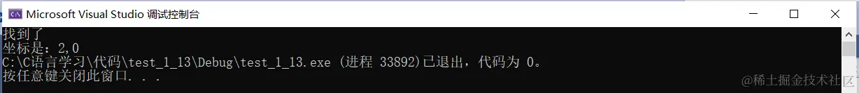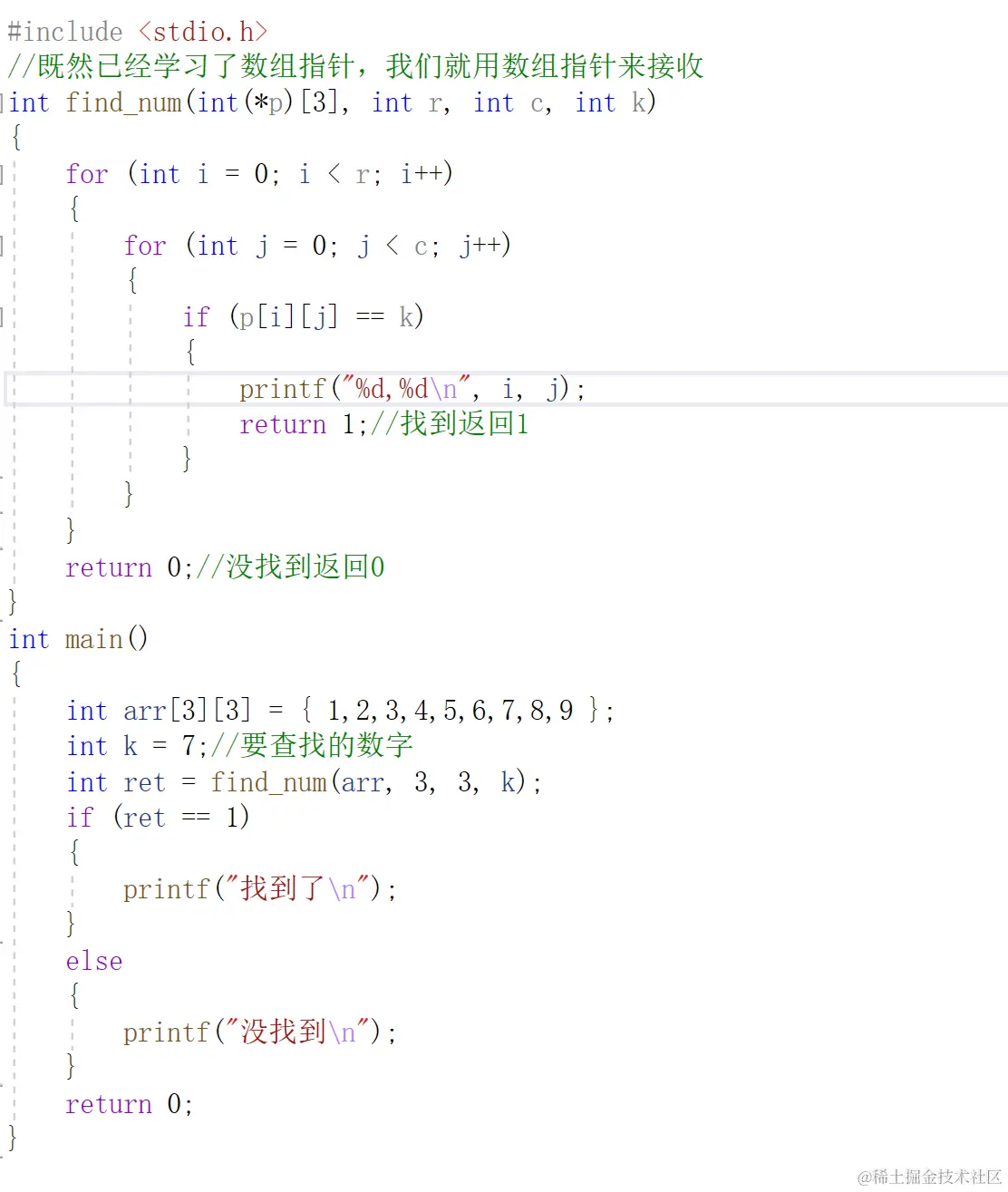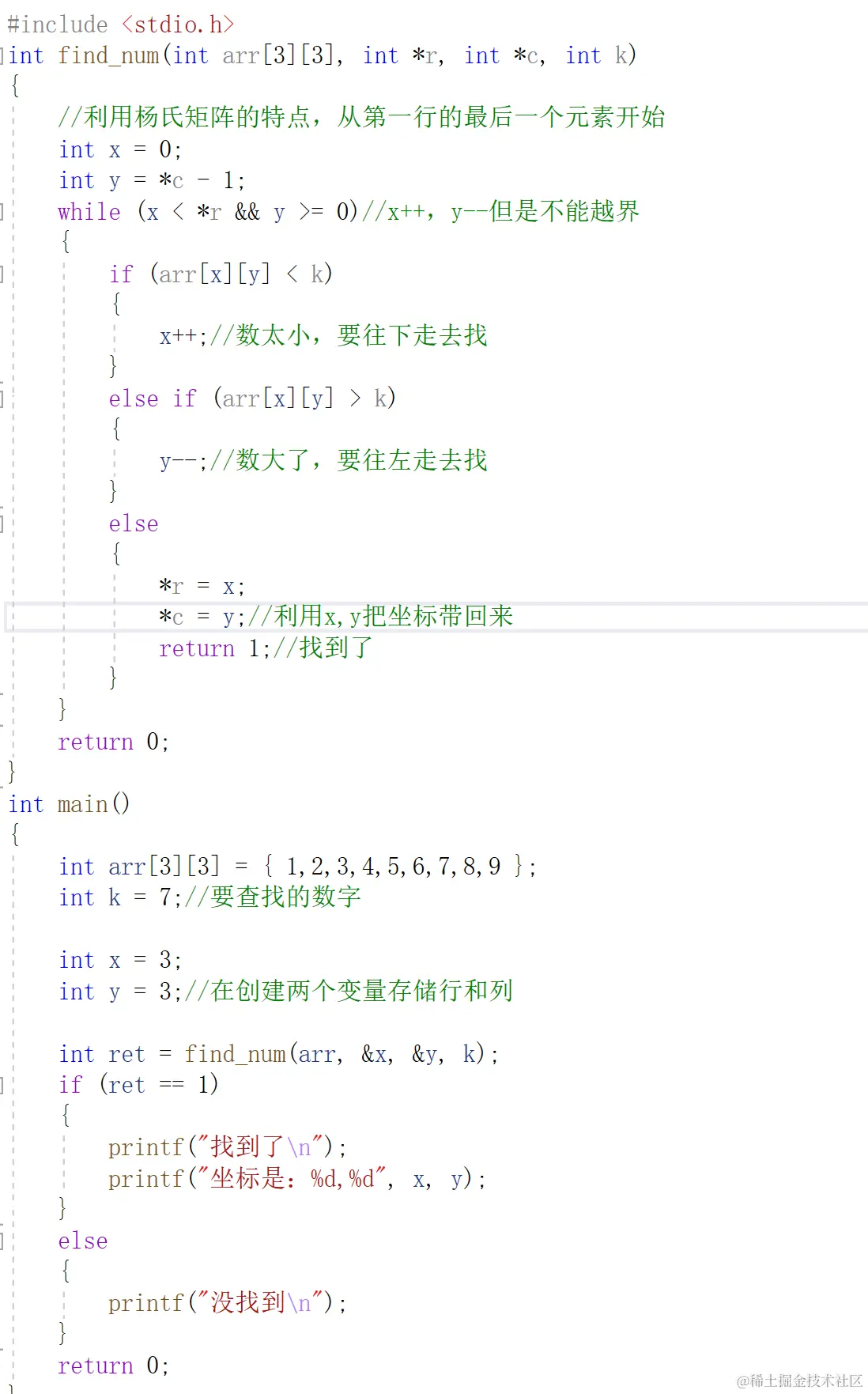 问题来了find_num函数我们只负责让它找,而不让它在函数内部打印怎么办呢?直接return坐标?显然是不可行的,return只能有一个返回值,不能一次返回两个值!所以我们不妨创建两个变量;利用值传递的方式把最终坐标带回来!
