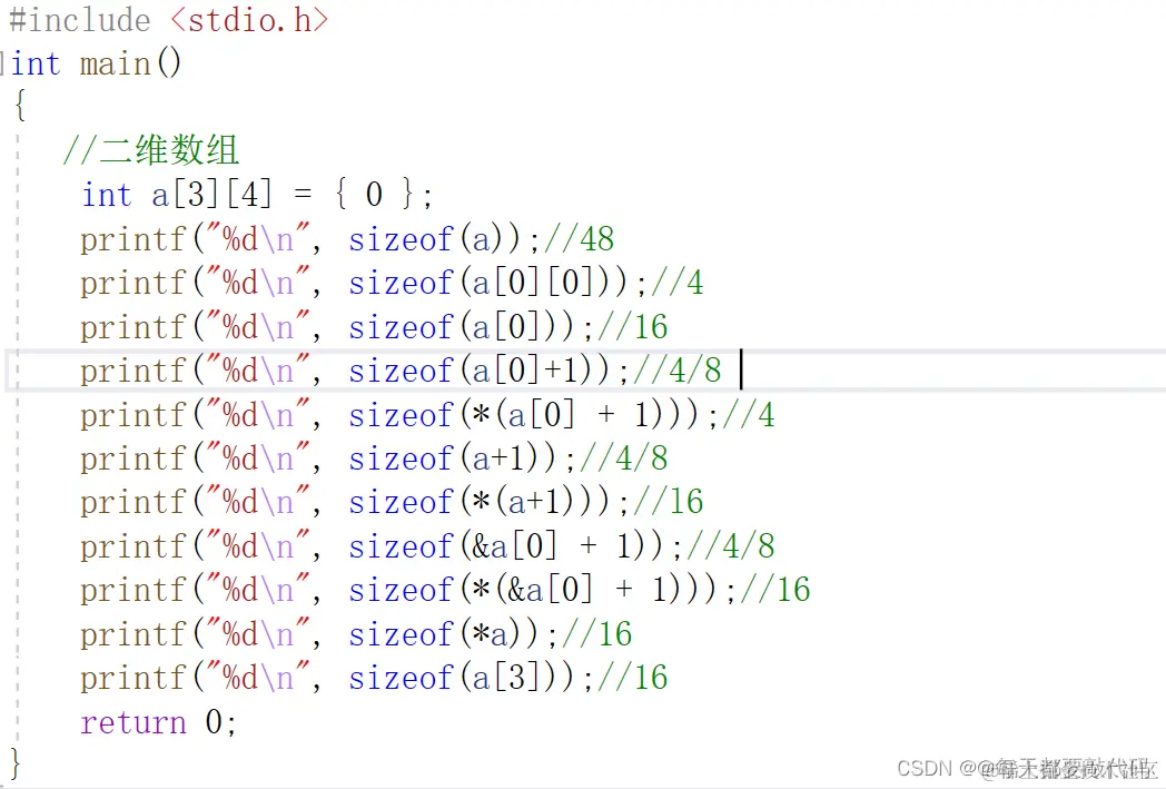 1、sizeof(a) ,数组名单独放在sizeof里面,求的是整个数组的大小;总共34 = 12个元素,每个元素是整型占4个字节;最终大小就是:**124 = 48**;