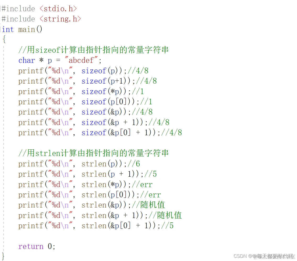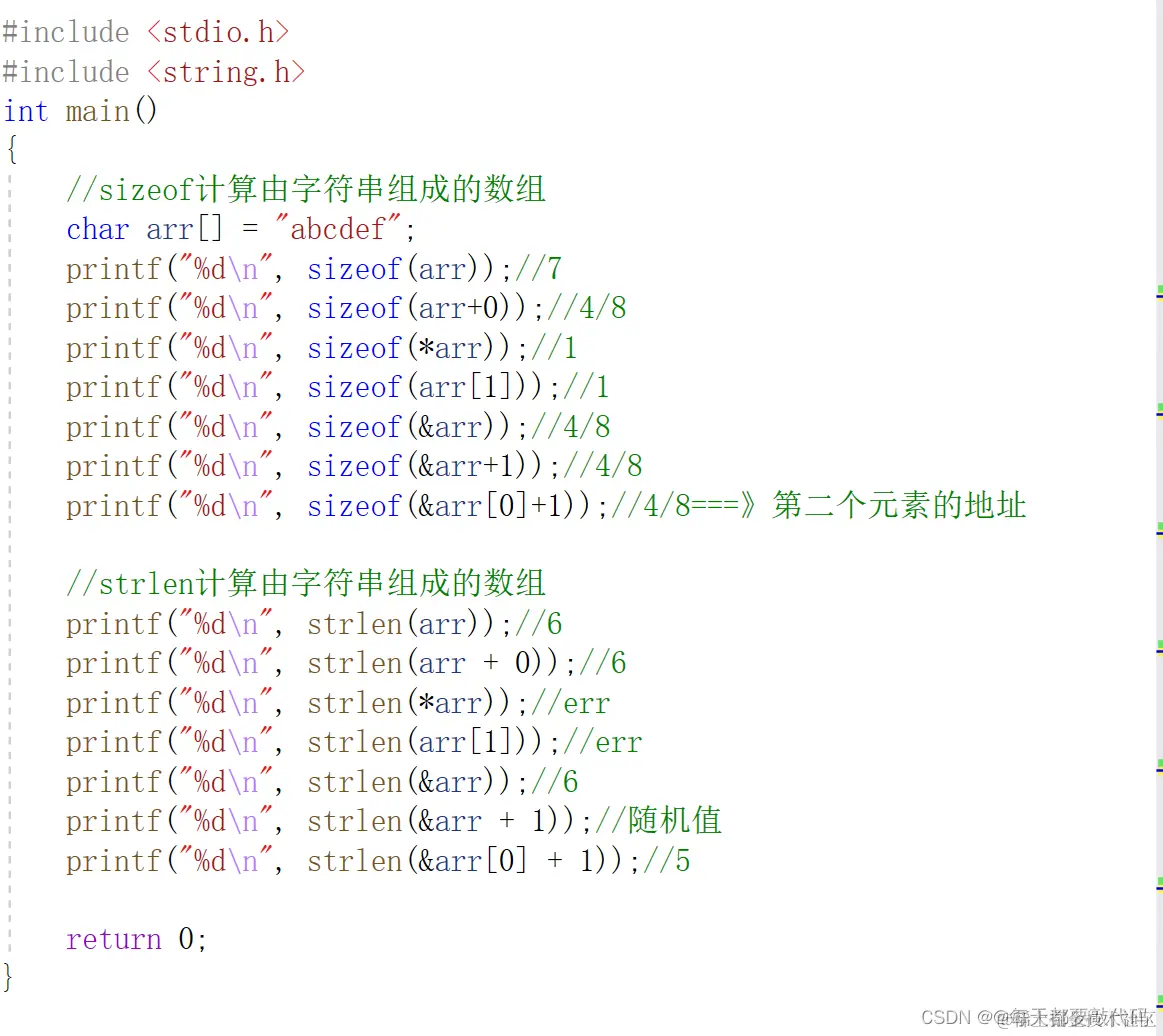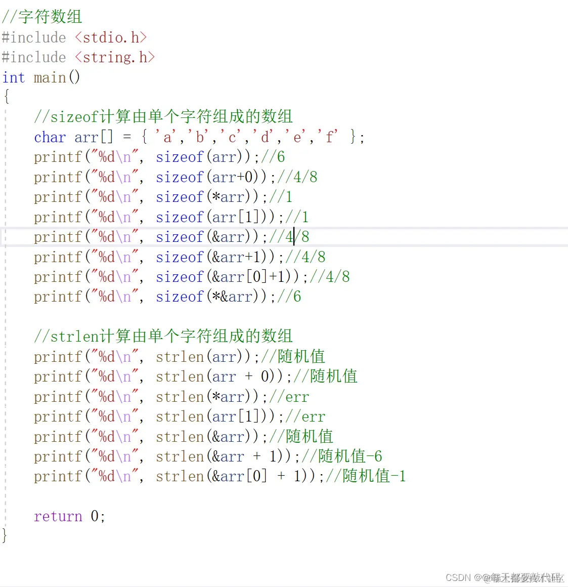 1、strlen(arr) ,strlen是找\0,而字符串刚好默认里面有\0,但是不算\0的大小;总共有6个元素;每个元素都char类型占1个字节,最终结果就是:6*1 = 6;
