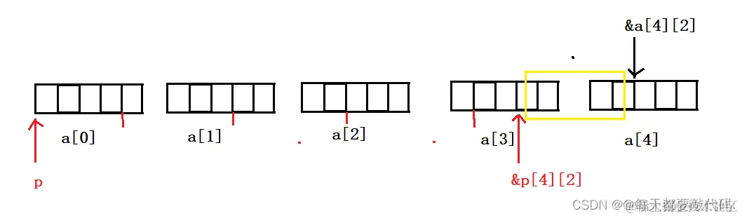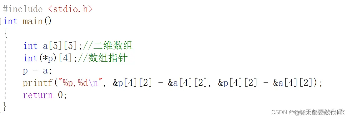 我们已经学过,指针-指针实际上中间元素的个数,从图中就可以看出相差4个元素;又因为是小地址-大地址,所以&p[4][2] - &a[4][2]以%d的形式打印出来就是**-4;** 对于-4我们以%p打印它的地址,又是怎么的呢?
