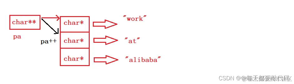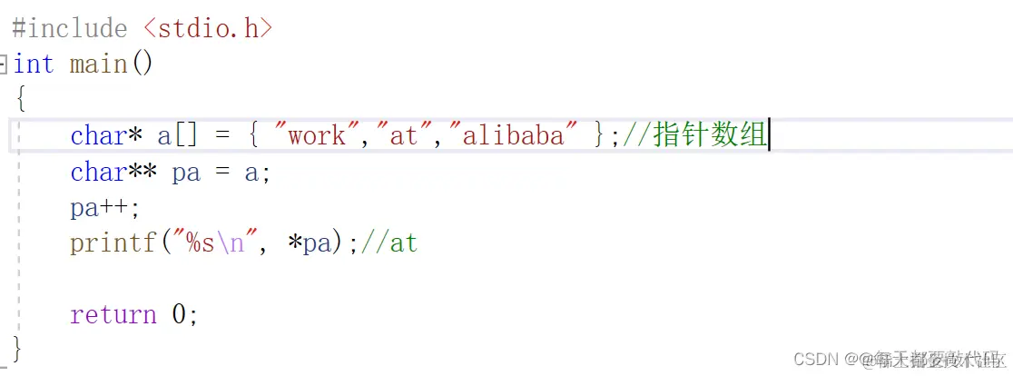 这道题只要我们分析清楚了,就很简单; char a[]是一个指针数组,数组的每个元素都是char;** 数组名a代表首元素的地址,也就是char的地址,需要一个二级指针pa来接收;pa++指针+1就改变了它的方向;最终我们pa解应用得到的就是存储的数据at的首元素地址,最终打印出来是at。