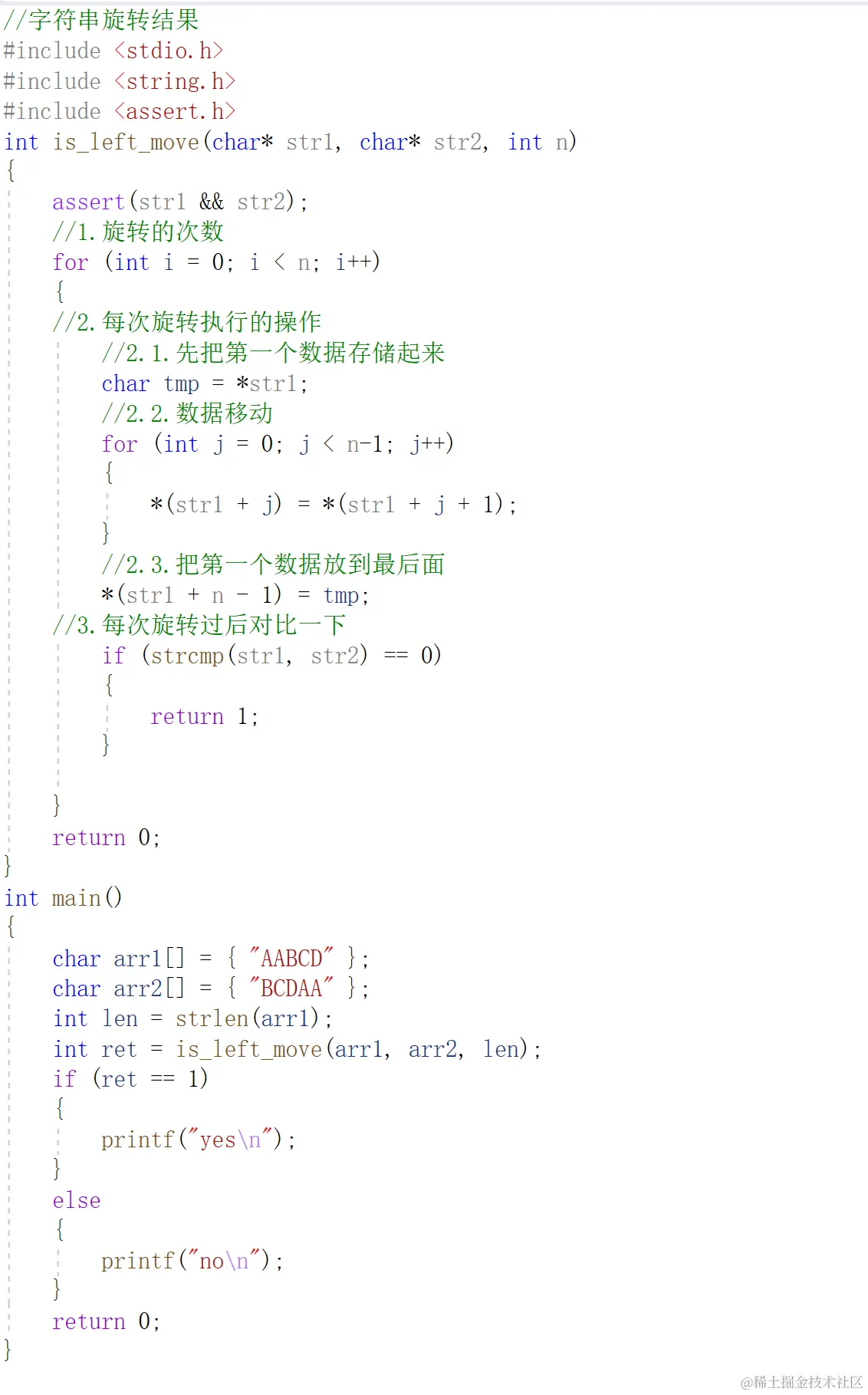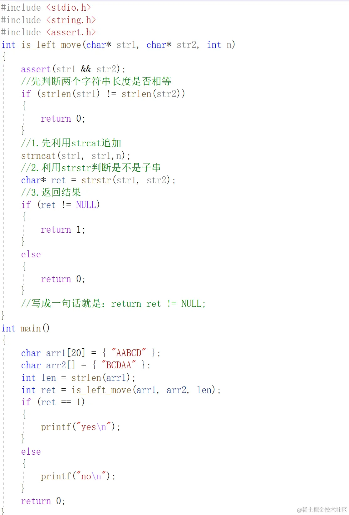 1、我们既然需要利用strncat把str1进行追加,例如:AABCD追加成 AABCDAABCD,所以arr1数组肯定要给足够的大小,我们是给的20!2、利用strstr判断一个字符串是不是另一个字符串的子串,我们会发现它的子串有很多;比如: AABCDAABCD,AA是它的子串,BCD等也是它的子串;但实际上我们要的是AABCD,是它追加之前的字符串长度;所以我们要加一个限制条件,先判断两个字符串长度是否相等!
