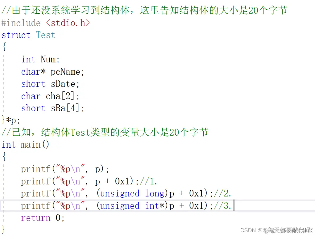 3、如果是结构体型指针struct Test* p,那么p+1就是跳过一个结构体的长度,这里就是跳过20个字节!