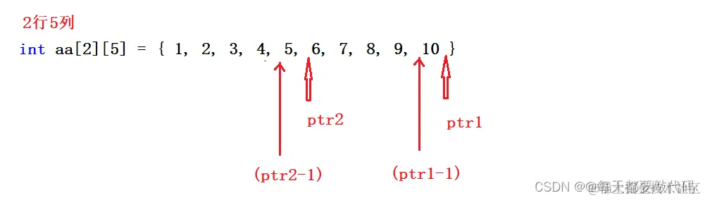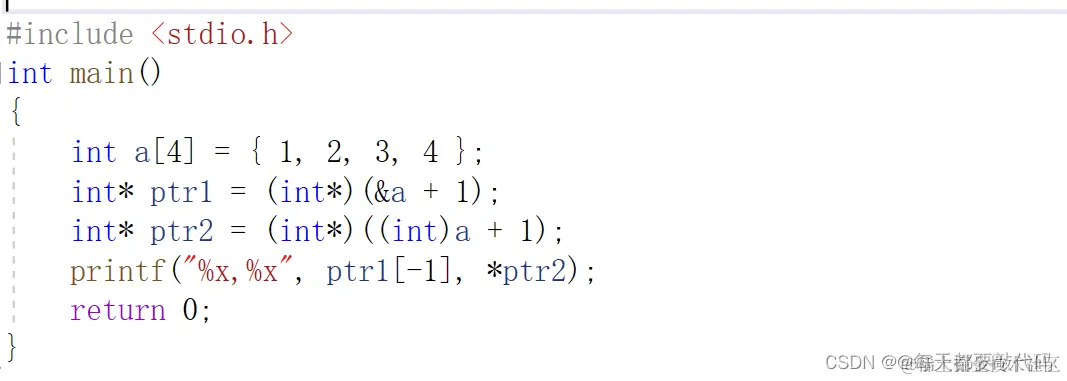 第一个问题: &a+1表示跳过一整个数组的下个数组的首元素地址,并把这个地址赋值给ptr1;ptr[-1]就等价于*(ptr-1);下面通过画图分析一下: