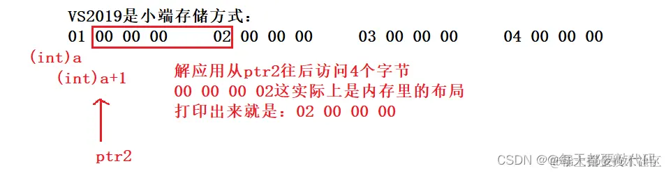 第二个问题: 数组a是首元素的地址,强制类型转换为一个整型,整型+1就是+1,跳过一个字节;而一个整型是占4个字节,所以我们就需要更细致的画图方式: