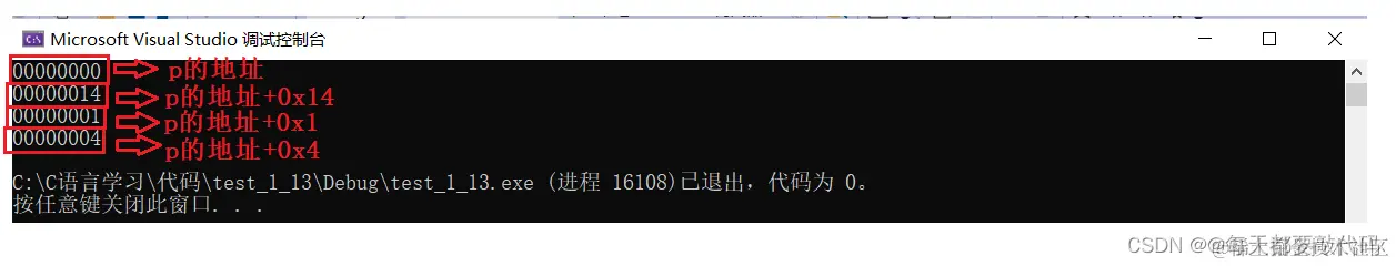 对于1: p+0x1,指针p+1跳过的是一个结构体类型所占的字节20,20转化为十六进制也就是14;所以最终的结果就是:p的地址+0x14;