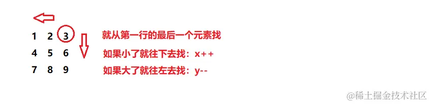 我们就利用杨氏矩阵的特点:矩阵的每行从左到右是递增的,矩阵从上到下是递增的;所以我们就从第一行的最后一个元素开始找:如果小了就x++,如果大了就y--!