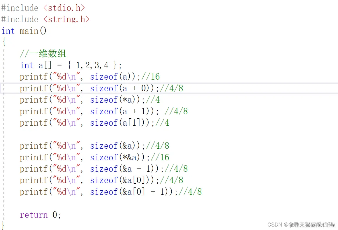 6、sizeof(&a) ,&a代表的是整个数组的地址;但只要是地址,无论是什么类型,谁的地址,只要是地址,结果就是4或者8;