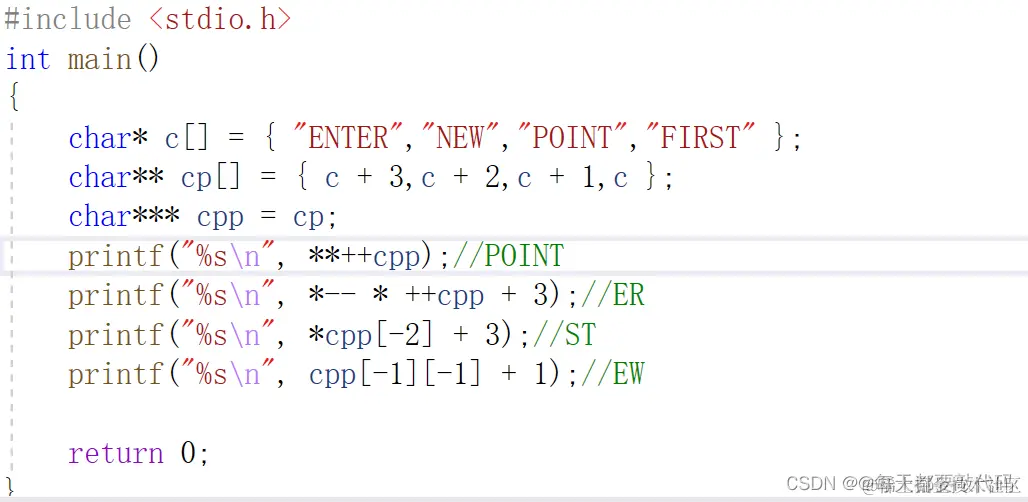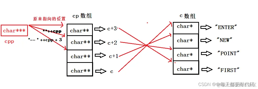 1、 ++cpp:++cpp指针指向下一个位置,我们第一次解应用++cpp,我们找到c+2;第二次解应用*++cpp,我们找到''POINT"的首元素地址;然后%s打印,最终就是POINT;