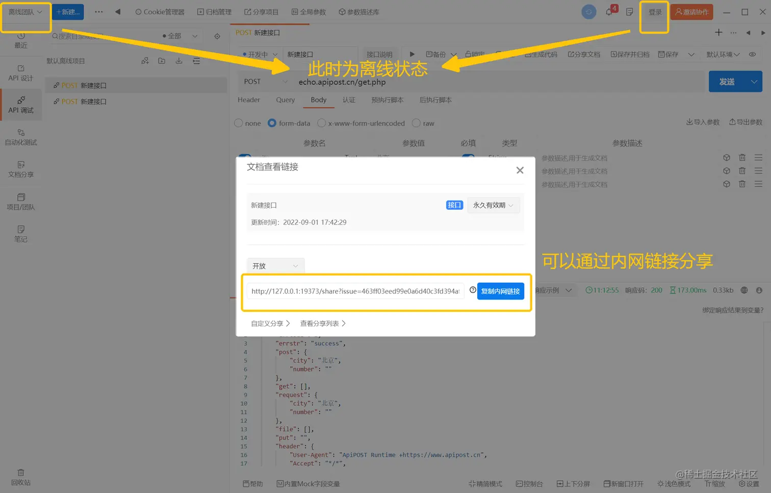 首先离线不登录可以调试接口什么的都是基本操作,Apipost有一个“内网分享”的功能,专门是为这种情况设置的,不得不说,真的很细心,方便的同时还保证了数据安全,平常在公司直接内网分享,又快又好。