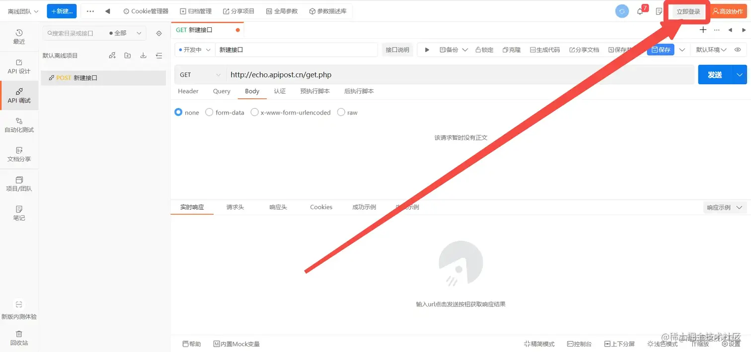 除了必须得登录才能用的功能,比如切团队切项目,团队实时协作(毕竟这种功能不登录确实是没法做到),其他正常操作全都可以离线不登录。而且我之前在Apipost的用户群里提过关于数据存储的问题,官方给的回答是数据会保存在本地,登录使用的时候会存在云端服务器上面,安全上也没有什么问题,可以放心使用了。