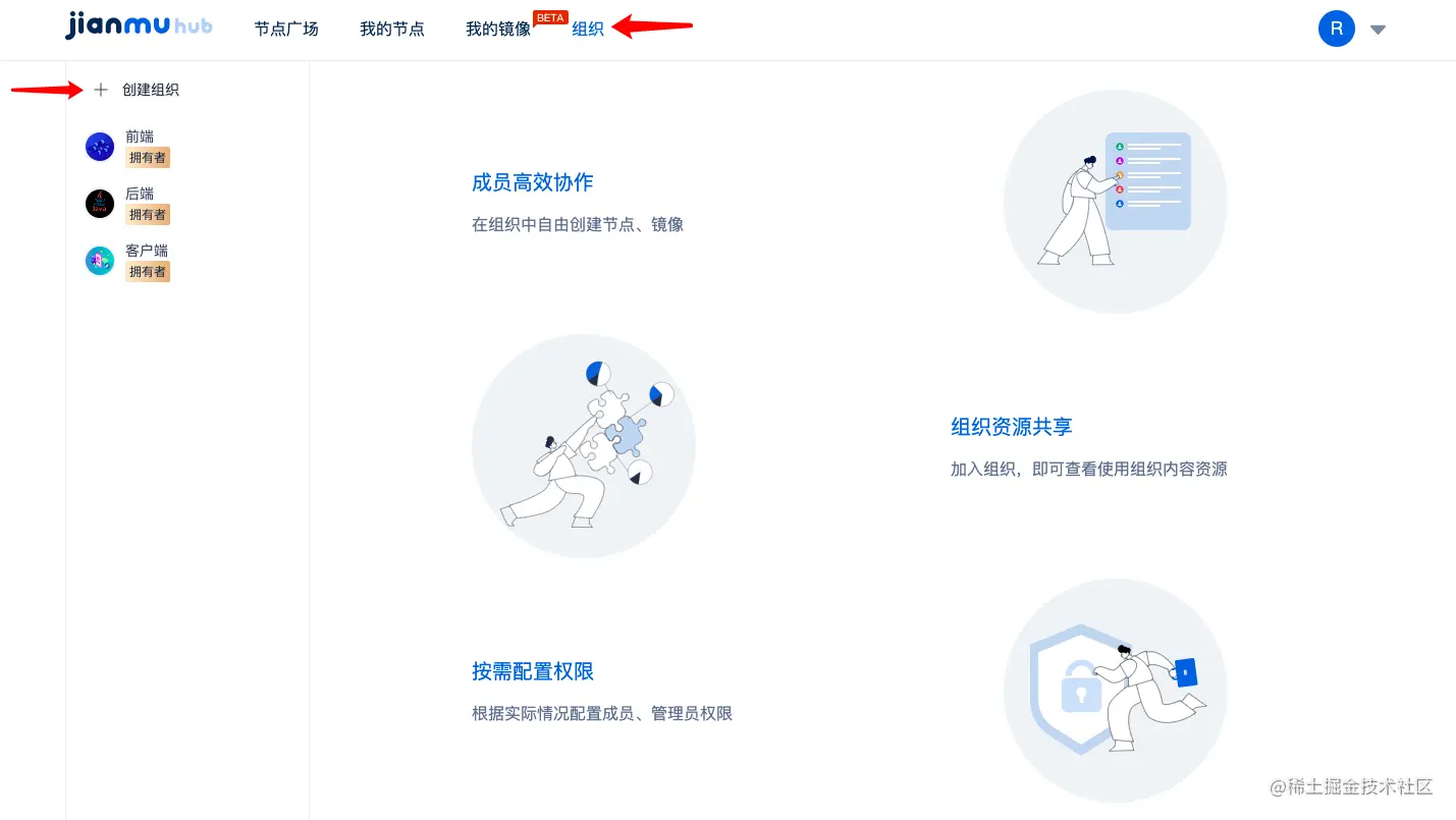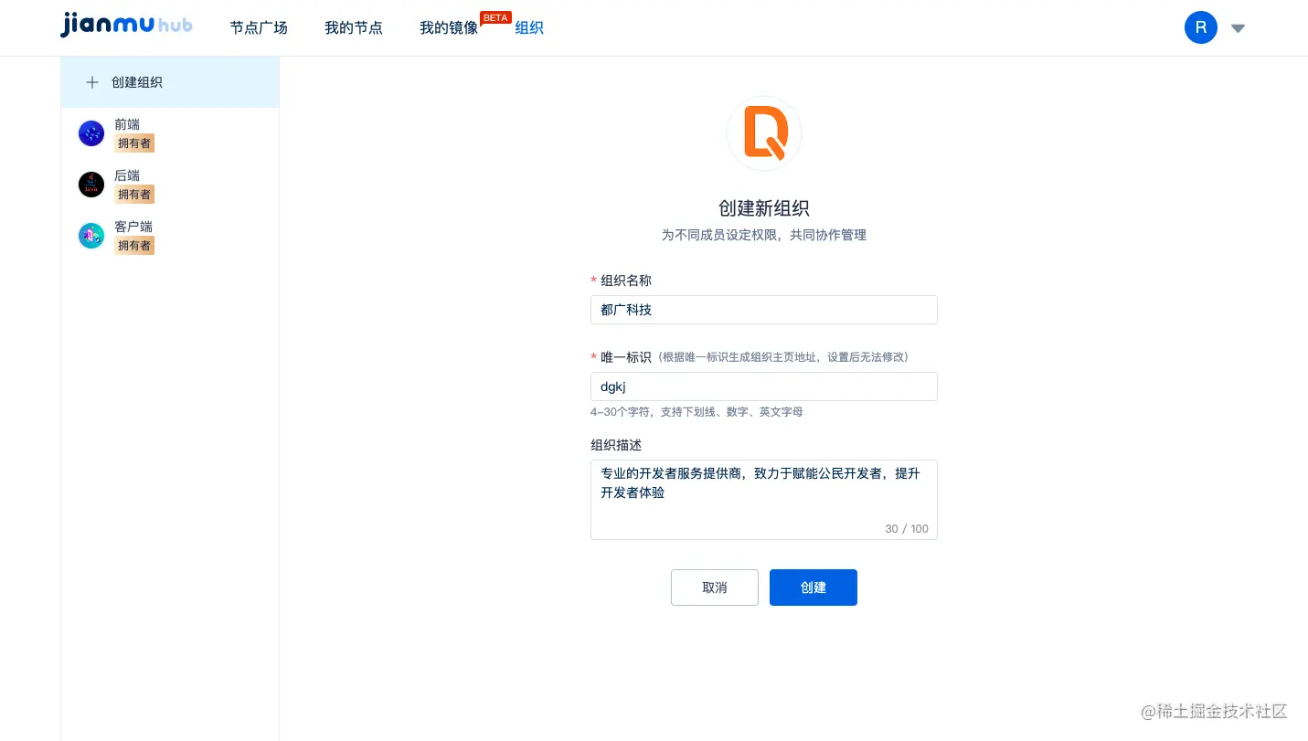 1、登录建木Hub,点击导航上的【组织】-点击创建组织