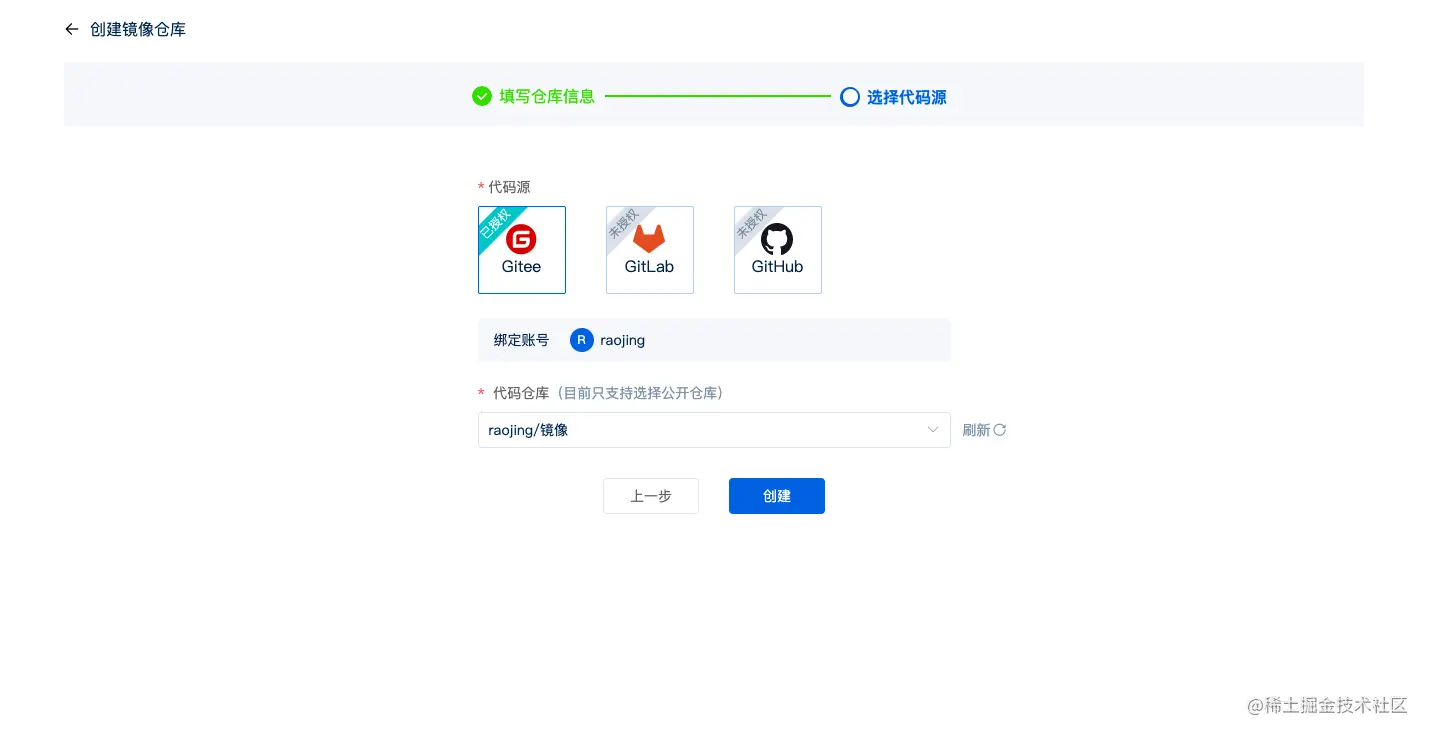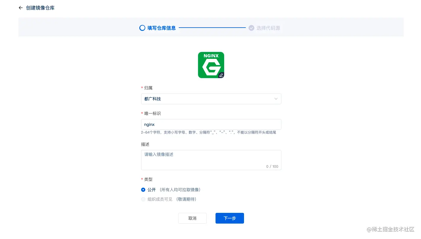 2、填写镜像仓库信息,记得将归属选为组织~