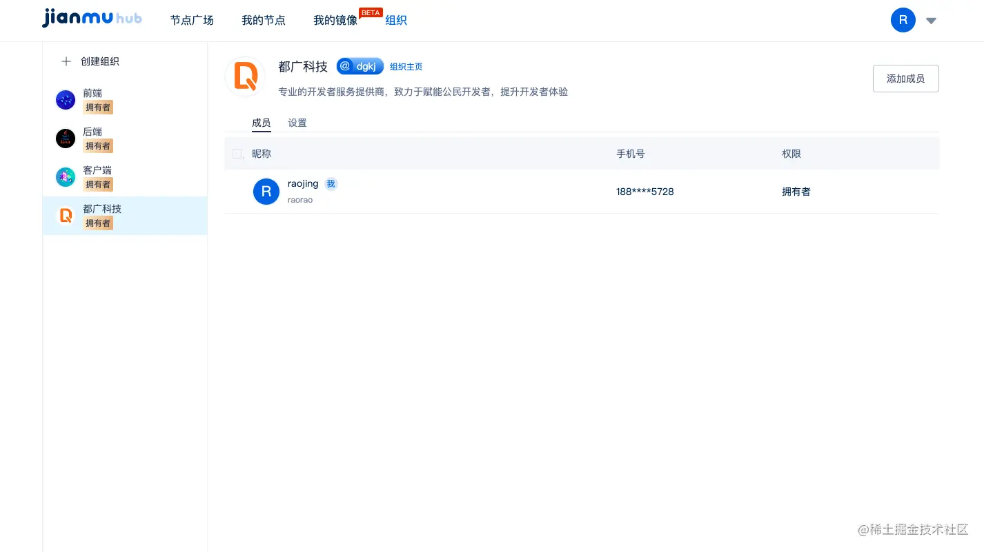 3、创建完组织后来到组织成员页面