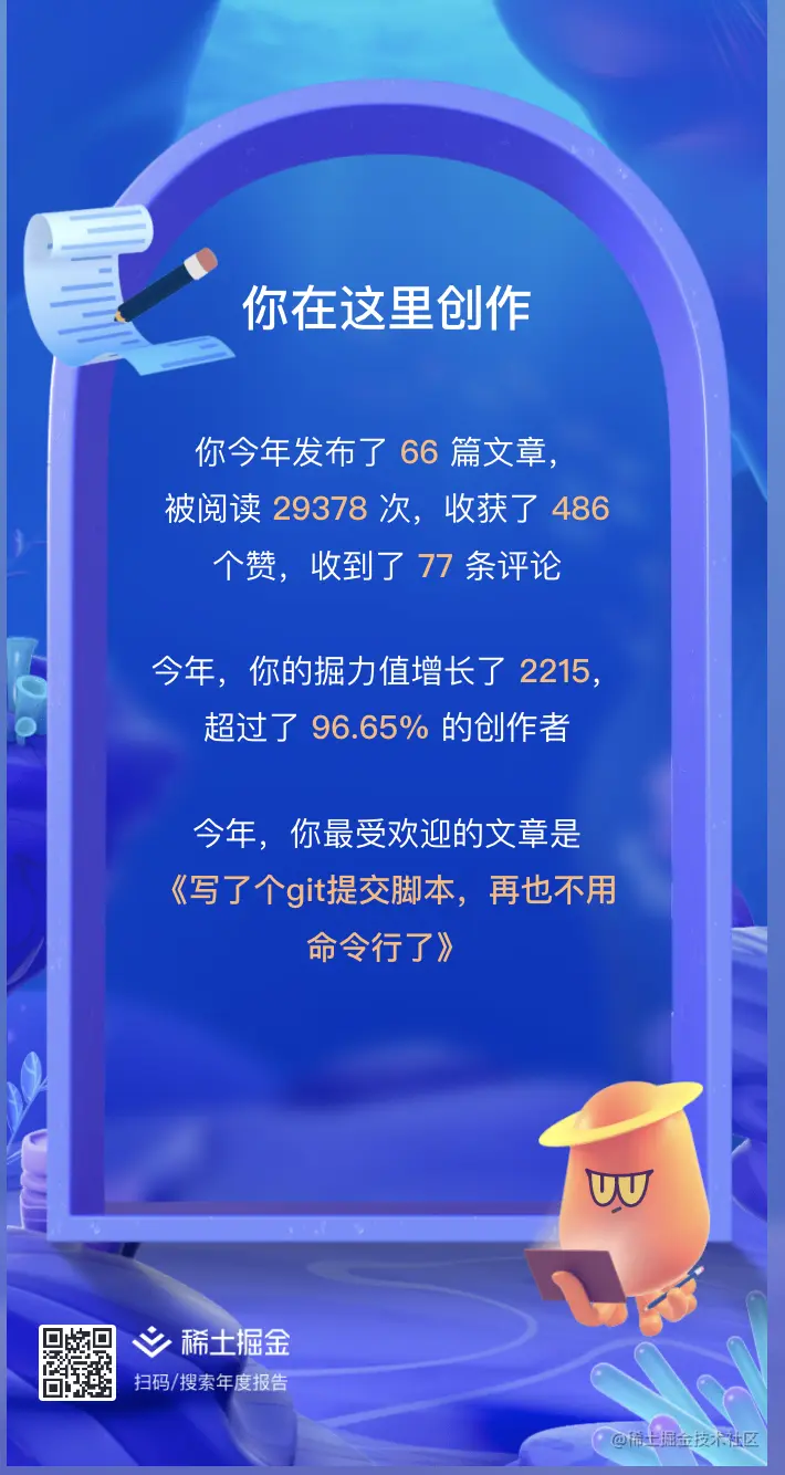 掘金的文章大多数是公众号自己更的原创文章搬运过去的,在公众号更文一年时间,目前收获600+粉丝,在公众号粉丝这块,也特别感谢几位博主,讶羽老师,前端巅峰,前端之巅,itclanCoder等博主对技术文章的转载。
